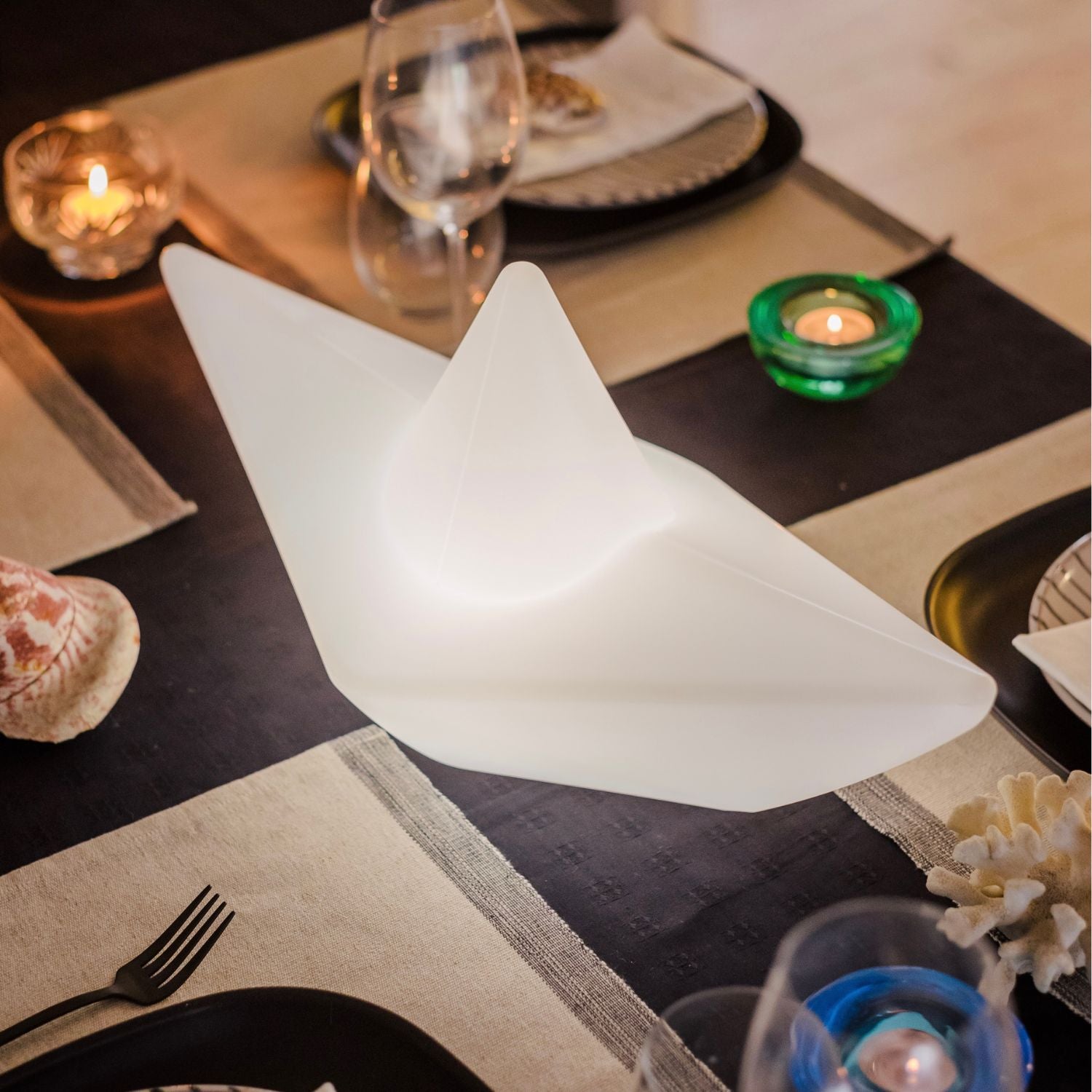 Entdecken Sie die Schönheit der Origami-Papierfalttechnik mit der BOAT-Leuchte - einem einzigartigen Designobjekt, das mit einem kabellosen LED-Lichtmodul ausgestattet ist. Ob auf dem Wasser oder an Land, diese bruchfeste, witterungsbeständige und schwimmfähige Leuchte verleiht jedem Raum einen Hauch von Stil und Eleganz.