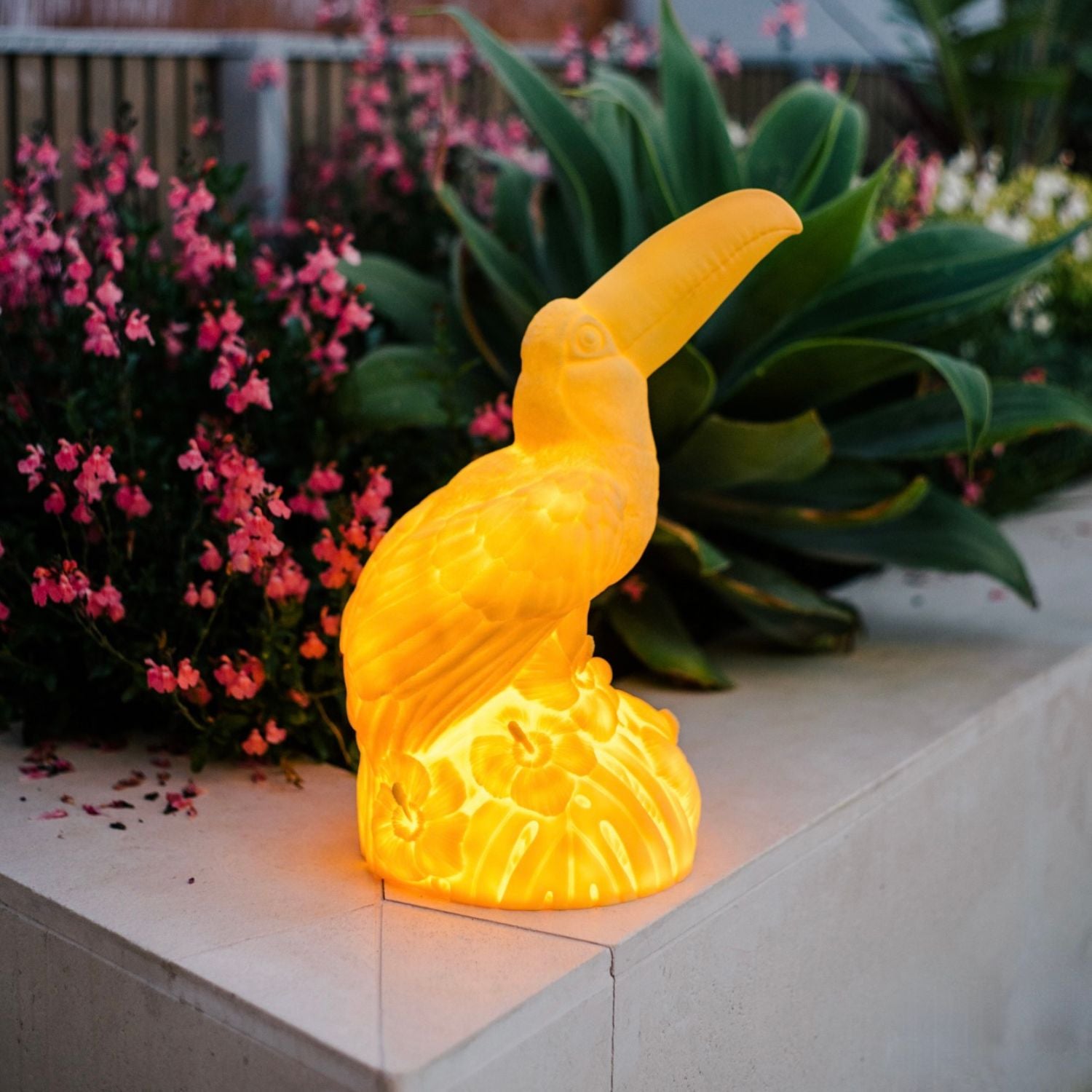 Mit einer Höhe von 45 cm sorgt der Tukan‑Körper aus hochwertigem Vinyl (Made in Spain) in vier frischen Farben für ein stilvolles und exotisches Ambiente.